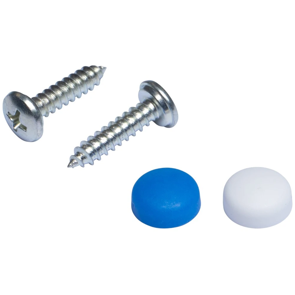 Fishbull Set Blechschrauben für Nummernschilder mit Flachkopf und Kreuzschlitz Antrieb. Das Set enthält 4 Blechschrauben und je 4 blaue und weiße Abdeckkappen. Die Schrauben eignen sich ideal zur Montage von Nummernschildern und anderen Blechteilen.