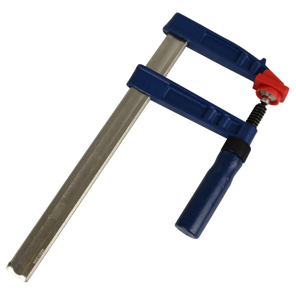Profi Schraubzwinge von GERMANIA, in vier Spanbereichen von 500 x 120 mm. Die Schraubzwinge hat eine geriffelte, verzinkte Profilschiene, Kunststoff-Schutzbacken und einen hölzernen Griff, blau lackiert.