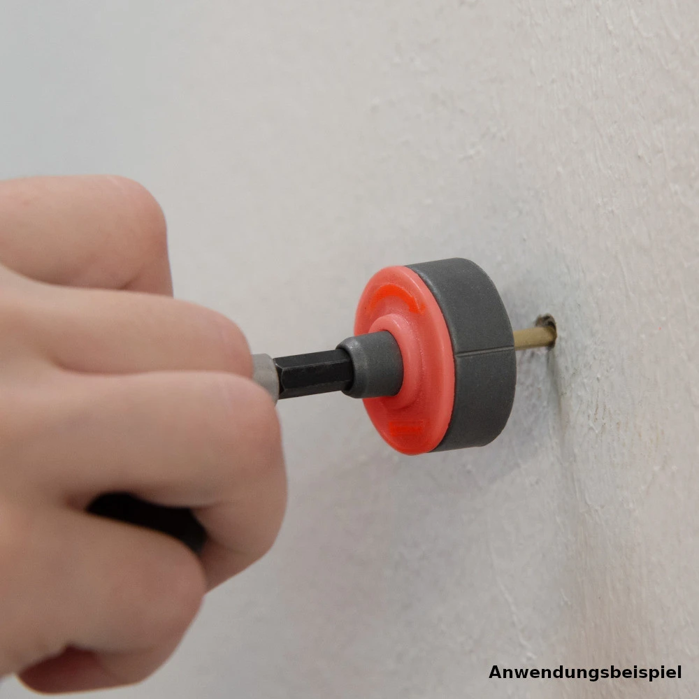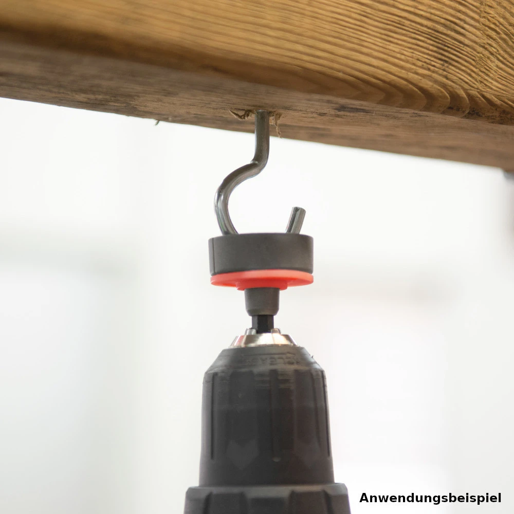 Hakendreher mit Bitaufnahme für Haken- und Ringschrauben bis zu einem Durchmesser von 6 mm. Der Hakenschraubendreher hat einen abnehmbaren Griff und kann dadurch als Handschrauber für zum Beispiel Bits oder Steckschlüssel oder mit einem Akku-Schrauber verwendet werden. In Verbindung mit einem Akku-Schrauber ist der Dreher für Haken bei einer Drehzahl von max. 20 RPM nutzbar. Der Handdreher ist ideal geeignet um einen Haken in Holz zu drehen.