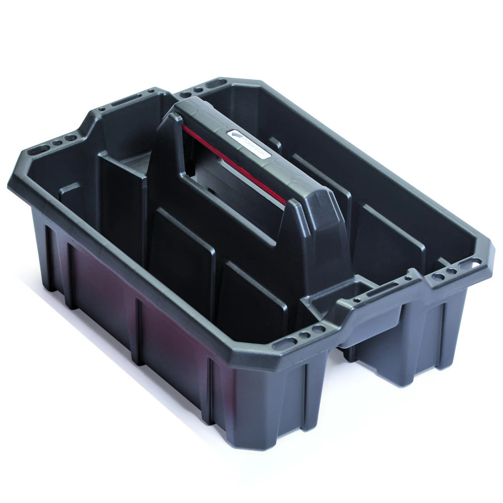 Handlicher Werkzeugträger in der Farbe schwarz mit zwei getrennten Kammern und praktischem Tragegriff, robust und sehr stabil. Gut geeignet zum sicheren Transport von Werkzeug und Kleinteilen. An den schmalen Seiten befinden sich praktische Einstecklöcher zum Transportieren von z.B. Schraubendrehern. Der Werkzeugträger ist aus schlagfestem und robustem Kunststoff gefertigt.